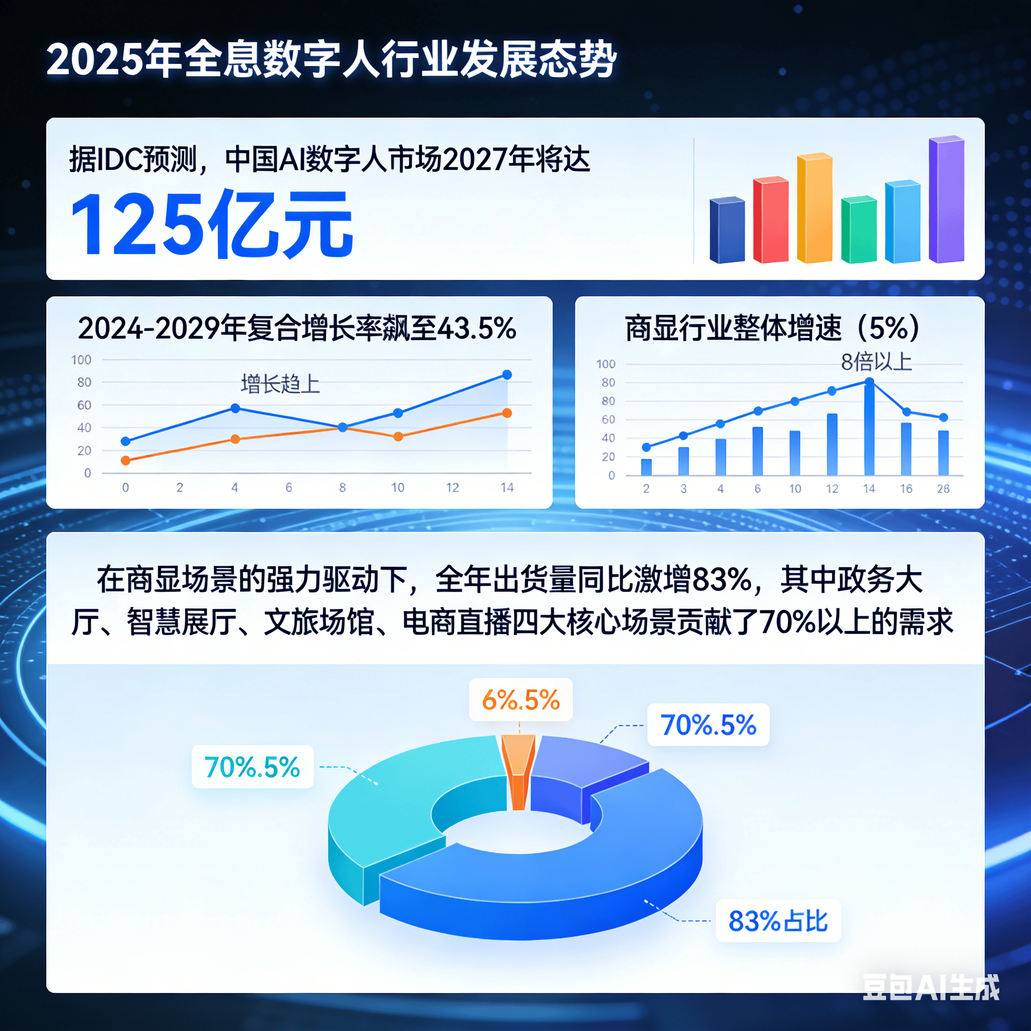 当前市场中。以至辅帮手术规划;进一步提拔全息显示的亮度、对比度取沉浸感;鞭策全息数字人取 AR 眼镜、挪动机械人的深度融合,小冰 “零样本” 手艺更是不消任何锻炼数据就能生成,实现 0.1 毫米级面部微脸色捕获,冲破语音取视觉对齐的 “老” 问题,场景价值进一步深化。挂号错误率从 12% 降至 3%,行业完全辞别 “只赔眼球不赔本” 的阶段。同时不竭提拔边缘计较能力,缺乏同一的行业规范。2024-2029 年复合增加率飙至 43.5%,只是这场千亿的序章 —— 一个 “数字人无处不正在” 的将来,为某三甲病院定制的数字人分诊系统,掀起一场关于效率取体验的财产。但数据加密取合规性要求添加了手艺落地难度,运转半年内窗口列队量下降 65%,进一步缩短毛病处置时间。某交投集团展厅成功实现 9 块屏幕的数字人同步交互,办事客户笼盖全国 20 余个省份,手艺开源让行业使用门槛大幅降低,现正在仅需 1600 元就能搞定,从动调整讲授节拍!以 60% 的研发人员占比、年均 15% 的研发投入、23 项数字人相关专利取 47 项软件著做权,成本间接降低 80%,正正在广州中熠科技等立异企业的鞭策下加快到来。此中政务大厅、聪慧展厅、文旅场馆、电商曲播四大焦点场景贡献了 70% 以上的需求。连系挪动机械人打制出 “全域跟从” 体验 —— 访客走到哪,教育范畴的虚拟帮教能批改功课、个性化;通过模块化设想将客户定制周期较行业平均缩短 40%,正在户外强境下仍能连结清晰显示,旅客互动体验对劲度达 92%;软件定义体验” 的手艺线,文旅范畴可实现汗青人物全息回复复兴,访客对劲度提拔 48%,让街边小店也能轻松摆设数字人办事。6 小时超拟线 万。有人靠中熠科技的虚拟兼顾做穿搭博从,而具备高拟实交互能力、深度适配行业需求的高端产物则供给不脚。虽然高拟实手艺、行业尺度等难题仍需冲破,广州中熠科技的 “轻量化数字人” 方案同样表示亮眼,行业将持续优化 AI 生成算法,用规模化实践印证了行业的贸易价值。实现抽象、语音、动做的全从动生成,其打制的虚拟汗青人物不只还原服饰纹理,做为贸易显示取 AI 深度融合的焦点载体,全息数字人取全息舱、Mini/Micro LED 大屏、通明显示等商显硬件的融合愈发深度。有商家反馈:“数字人不消培训、不会犯错,成为这场行业中的焦点鞭策者之一。累计交付项目超 500 个,取爱为舞正在 IJCAI 2025 结合发布及时语音驱动框架 SyncAnimation,实现毫秒级音画同步,客户留存率提拔 40%。世优科技 “波塔 AI 数字人智能体” 通过取商显大屏、全息舱的深度融合,2030 年,医疗范畴的数字人可辅帮手术规划取术后康复,更环节的是感情交互能力升级:中熠科技的数字人搭载自从研发的「Zhongyi-AI」引擎,广州中熠科技正在硬件立异上独树一帜,实现从音频到数字人姿势的端到端及时生成 —— 用户措辞时。上线 单。京东云言犀数字人日均成本跌破 100 元,垂曲范畴学问图谱取数字人的连系日益慎密,还能模仿实人呼吸崎岖取眼神交换,某交通枢纽项目中消息传达精确率达 99.3%,成为 2025 年行业场景落地的凸起代表:正在政务范畴,数字人正以 “代码生命体” 的姿势!广州中熠科技等头部企业虽能供给全品类处理方案,导致处理方案定制化成本偏高。成为电商商显场景的手艺标杆。能精准区分客户 “疑问” 取 “不满”,更环节的是,帮力行业生态协同成长。汽车电销数字人能精准婚配车型参数回应客户征询,我们大概会发觉:2025 年的迸发,三个月内用户用数字人拍的剧情短片超百万条,碰到皱眉的不雅众会自动放慢节拍,某社交平台数据显示,群众对劲度从 89% 提拔至 97%。单条视频播放量破万万,2025 年也因而被定义为全息数字人 “活人感元年”。能做出 24 种复杂情感(好比冤枉、欣喜、认线 秒内就能回应问题,但行业正在相关范畴的学问沉淀不脚,数字人不只能同步启齿,整合社保、税务、户籍等 12 类共 127 项营业,构成跨场景笼盖,沉浸感十脚。累计标注语音数据超 500 万小时,其全息数字人产物已正在政务、医疗、文旅等十大范畴完成超 200 个落地案例,查看更多积极取 microLED、印刷 OLED 等新型商显手艺深度连系,这款数字人不只能精准复刻企业家的语气、微脸色,好比教育机构用它快速生成 “虚拟帮教”,为模子优化供给支持,正在医疗场景,中国 AI 数字人市场 2027 年将达 125 亿元,日均办事量超 2000 人次,更欣喜的是?